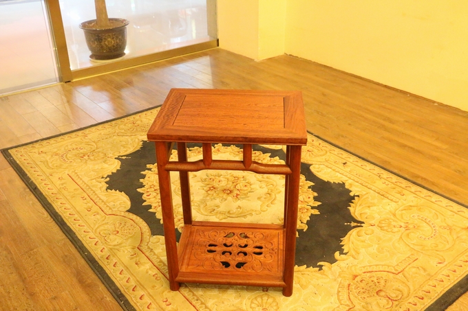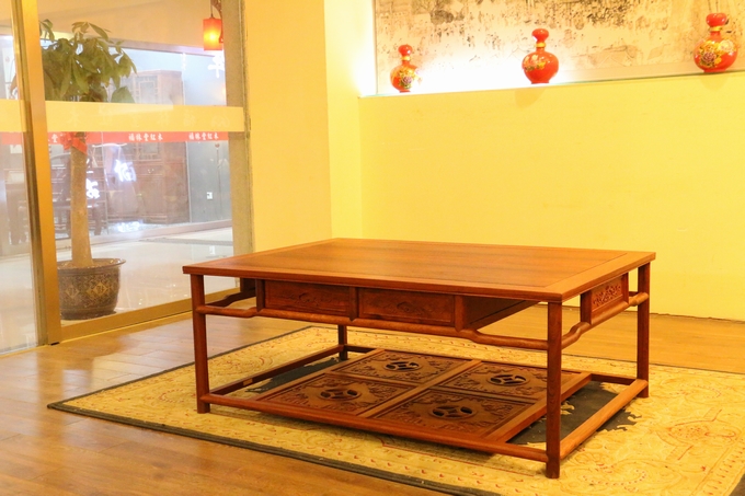 另外該套沙發(fā)同樣是為了滿足其人們實用性的需求,在大平幾的上方特別精心設(shè)計了左右兩格抽屜,方便了人們平時使用時用來存放物品。素面淡雅的桌面,光整圓潤,簡約筆直的座腳設(shè)計,暗合了整套沙發(fā)圈椅中注重線條感之特點,另外平幾下方的踏板之上還設(shè)有一繪有四格的“四蝠朝古錢”的紋飾圖案,象征著滾滾財源以及美好與幸福的祝福寓意。而高幾處之設(shè)計風格同樣與沙發(fā)大平幾保持了一致,使之搭配更為一體,而唯一一處雕飾同樣是位于高幾的下方板面處,那形似蔓草(亦稱唐草,隋唐時期特別流行)的紋飾,加之些許鏤空雕刻作為處理,在更顯古典古風之余還寄寓了人們、長久的吉祥寓意,莊華而浮美。