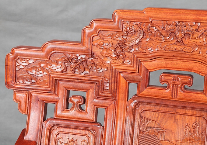云,它是中國圖案中十分重要的裝飾元素之一。而古人又都常在銅器、木刻、壁畫以及服飾上創造出了各種層出不窮的云形圖案。中國意匠的云形,不僅形象豐富生動,而且更富有中國圖案獨有的意境美,那飄急繽紛的流云伴隨著神仙、神禽、寶物等,猶如在你眼前呈現出的一幅笙歌悠揚、騰云駕霧、如縷仙境一般的神域氛圍感受。紅木家具而那些被古人憑之以色彩可以用來察卜吉兇征兆的五彩繽紛的云,也被稱之為祥云,在裝飾意義上多用它來呈現祥瑞福壽之寄寓,以示祝福。