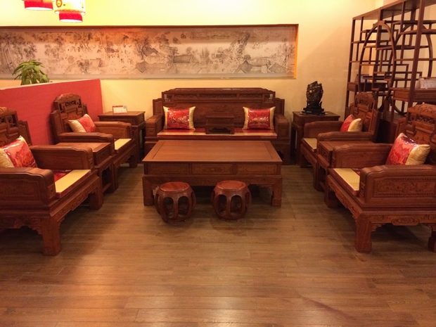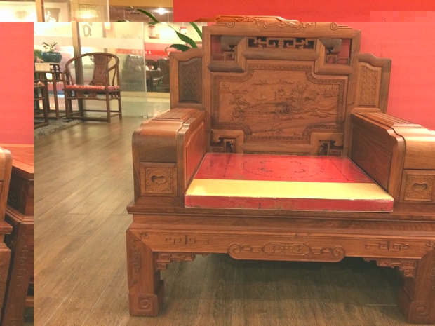 而今天,我們福林堂紅木要為大家介紹的這一款客廳系列的家居用品,也正是為了表達這一初衷和愿望,以之為名的——錦上添花沙發。好上加好的美好寓意,為你每一天的生活都增添色彩,妝點著幸福。該款沙發的靠背板處以及扶手的上方均富有寫實性的雕花,借以用來比喻“錦上添花”中的小花;而融合了文人墨士情趣的背靠板處的主體圖案“松柏樓臺庭宇遠山”圖更是為整體沙發營造出一種身臨其境的絕美意境,陶冶情操。沙發上隨處可見的回紋雕刻寓意復制綿延不絕,永傳后世。沙發的扶手略有不同,扶手處前方加有小抽斗,方便收納各類小物品。精細的雕刻加上流暢的線條,以及采用的優質緬花材質,使得沙發整體:凝重不失風流,張揚不失穩重,華麗不失身份,確實是為一處用來拿來裝點生活,留置家用,添備居所的良好家居用品。