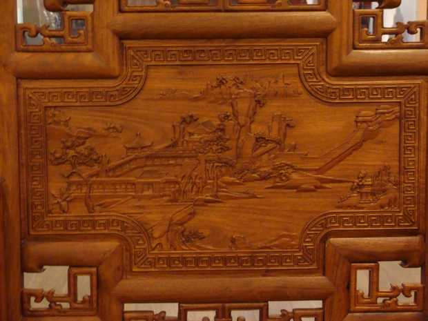 平直的背板正面中央是為一呈十字交叉分布的方形圖案,其畫面清秀唯美、矯健的松柏依悉而立,倚圍墻靠山野云海而居的亭臺樓宇景觀更突顯著不俗的文人情懷雅致,而遠處為云霧所繚繞的山峰高聳林立,顯得十足地巍峨壯觀,整幅畫面遠景近景層次分明,脈絡清晰,如同一幅絕美的文人畫映入眼簾,置身于畫中,可以感受到那股空透悠遠,清幽絕塵,遠離世俗塵囂的意境,浮縷于間。而在該處十字方形圖案靠背板處的背面則還雕繪有一大字體形狀的“?!弊謭D案,圖案四周為彎延的呈軸對稱分布的花環所圍繞,顯得十分美艷,