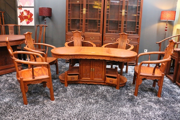 一套線條流暢、制作工藝精致的志成紅木茶臺,加上枝條類的東方插花,一搭一配中,盡顯茶室的和、靜、